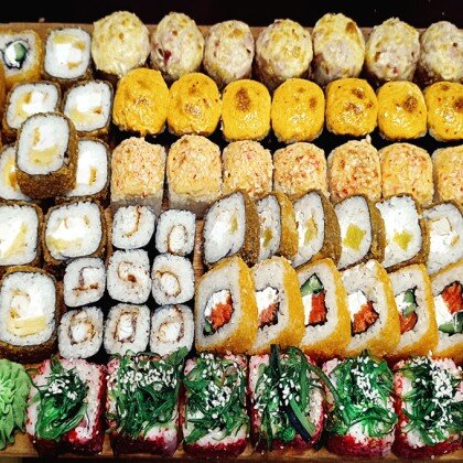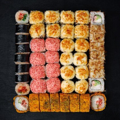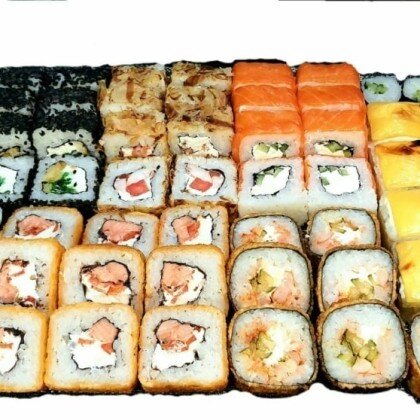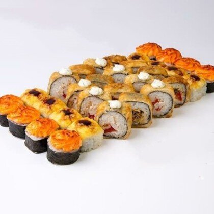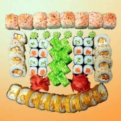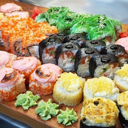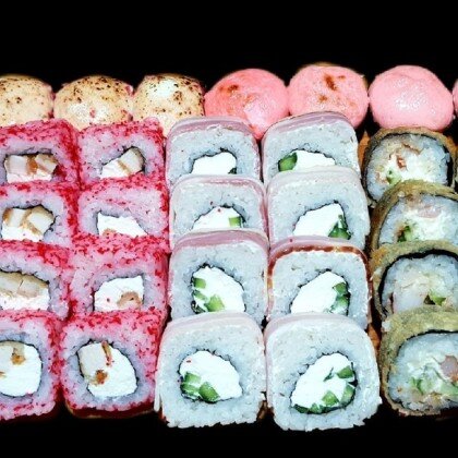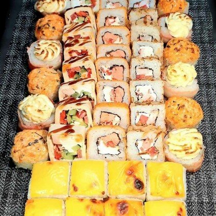 Ролл «Лава классическая», ролл «Калифорния», ролл «Сяке Темпура», ролл «Филадельфия» в кунжуте, ролл «Капа Маки», ролл «Сяке Маки»